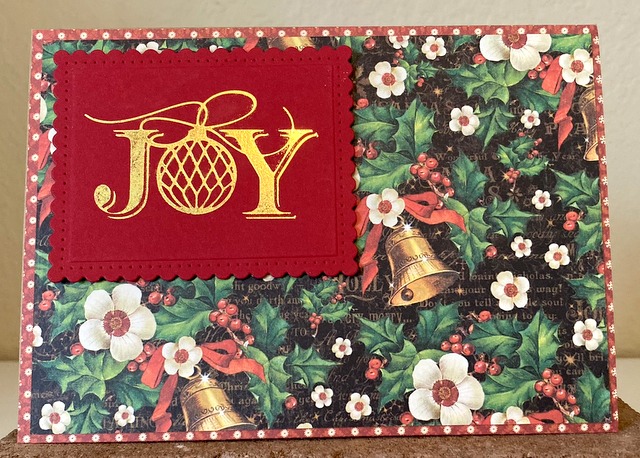 This is a 5″ by 7″ card. The pattern paper is from Graphic 45 St. Nicholas Collection – page “Bells and Bows” and page “Christmas Cheer”. The Glimmer Plate is “Joy” by Spellbinders.
