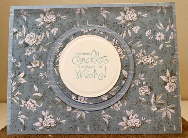 This is a 5″ by 7″ card. The pattern paper is “Provence Collection by Stamperia. The die is Spellbinders “Fancy Edged Circles”. The bling is “Indigo” by Queen & Co. The ink is “Wild Lilac” by Gina K Designs.