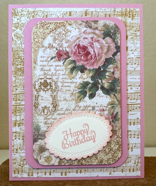 This is a 5″ by 7″ card. The pattern paper is from “Ceremony Collection” by Stamperia. The die is Spellbinders “Fancy Edged Ovals”.