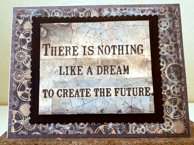 This is 5″ by 7″ card. The pattern paper is “Voyages Fantastiques Collection” by Stamperia. The die is Spellbinders “Fancy Edge Rectangles”.