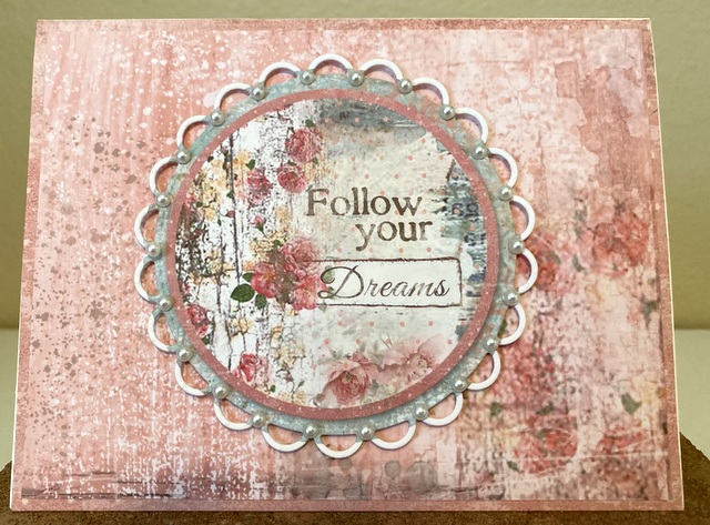 This is a 5″ by 7″ card. The pattern paper is from “Dream Collection” from Stamperia. The die is Spellbinders “Open Scallop Edge Circles”. The bling is from Queen & Co. “Pearl”.