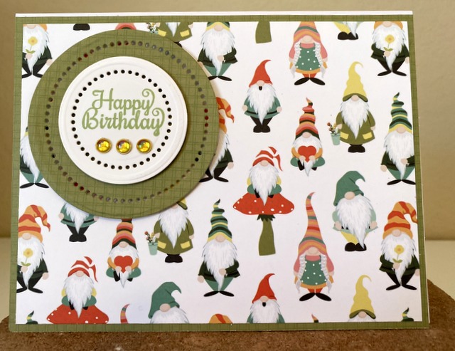 This is a 5″ by 7″ card. The pattern paper is Photo Play Tulla & Norbert Collection – pages “Gnomies” and “Tiptoe Through the Tulips”. The die is Spellbinders “Essential Circles”.
