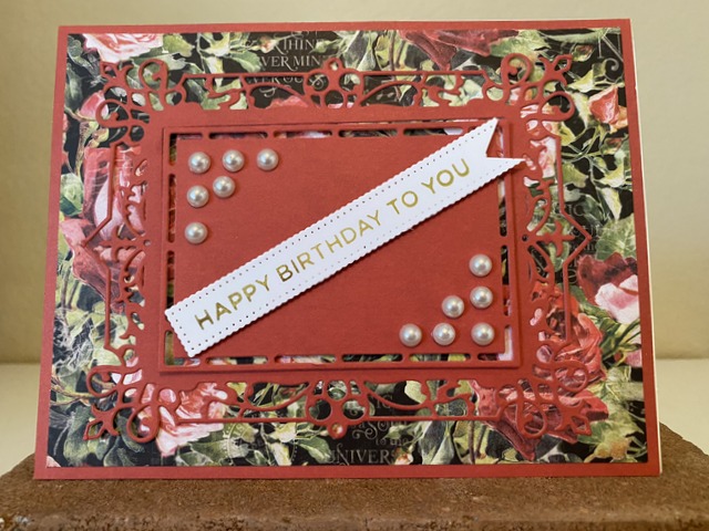 This is 5″ by 6 1/2″ card. The pattern paper is from Stamperia Grand Hotel Collection. The cardstock is “Cranberry Tart” by Gina K Design. The die is Spellbinders “Fluted Tracery”. The bling is metallic bubbles by Queen & Co.