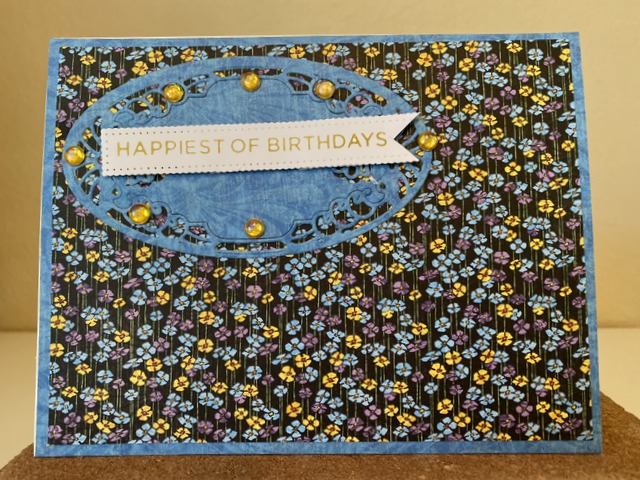 This is a 5″ by 7″ card. The pattern paper is from Graphic 45 Life’s a Journey Collection – page “Keep Moving”. The sentiment is from “Glimmer More Sentiments” by Spellbinders. The die is Spellbinders “Bella Luce Oval”. The bling is from Queen & Co – “Yellow Bubbles”.
