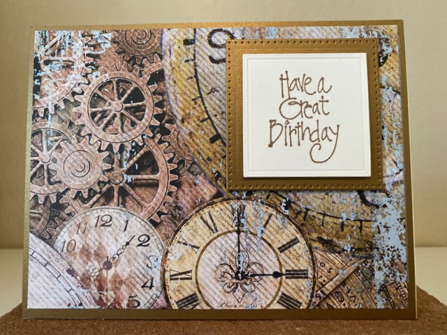 This is a 5″ by 7″ card. The pattern paper is from Stamperia Collection “Clockwise”. The die is Spellbinders “Scored Pierced Squares”.