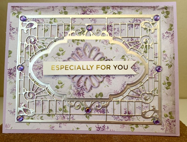 This is a 5″ by 6 1/2″ card. The pattern paper is from Stamperia. The cardstock is “Lovely Lavender” by Gina K Designs. The die is Spellbinders “Ornamental Valance”. The bling is “Purple Irridescent Bubbles” by Queen & Co.