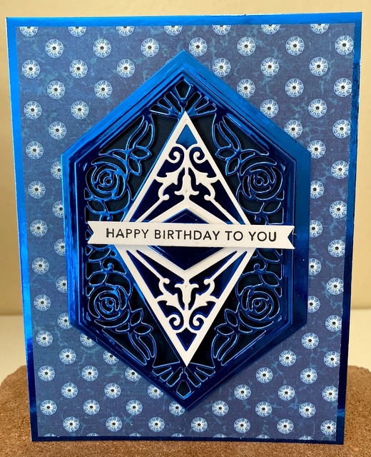 This is a 5″ by 6 1/2″ card. The pattern paper is from Graphic 45 Ocean Blue Collection – page “Antigua”. The die is Spellbinders “Rosa Diamante”.