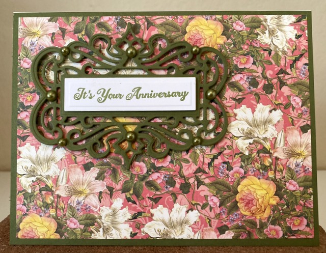 This is a 5″ by 7″ card. The pattern paper is from Graphic 45 Love Notes Collection – page “Floral Symphony”. The sentiment is “Glimmer More Sentiments” by Spellbinders. The die is Spellbinders “Callista Rectangle Shadowbox Frame”. The bling is from Queen & Co.