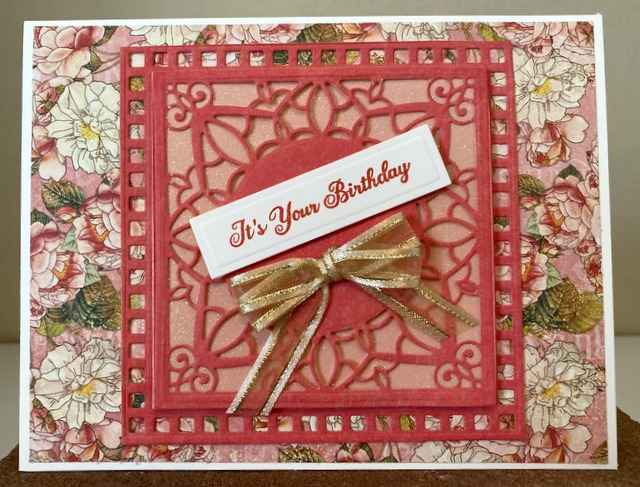 This is a 5″ by 6 1/2″ card. The pattern paper is from Graphic 45 Princess Collection – page “Roses for Royalty”. The die is Spellbinders “Richelieu Square”.
