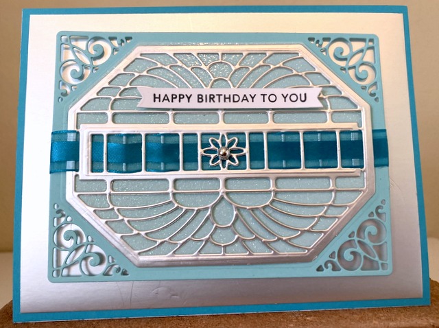 This is a 5″ by 6 1/2″ card. The cardstock is “Sea Glass” and “Blue Lagoon” by Gina K Designs. The die is Spellbinders “Sentimental Finery”.
