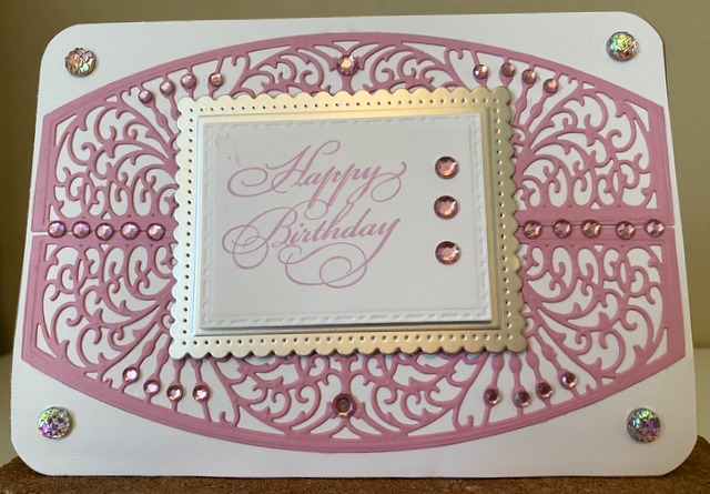 This is a 5″ by 7″ card. The dies are Spellbinders “Amazing Paper Grace Die of the Month 2/2019” and “Fancy Edged Rectangles”. The bling is “Pretty in Pink” by Queen & Co.
