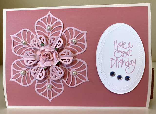 This is a 5″ by 7″ card. The cardstock is from “Festive Pinks Rose Paper Pad”. The die is Spellbinders “Starburst Petal Doily”. The bling is “Pearl” by Queen & Co.
