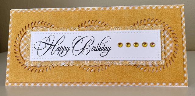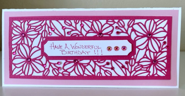 The card is 4″ by 9″. The die is Spellbinders Blossoming Slimline. Please wear a mask when you go out and stay safe. Have a wonderful Monday!!