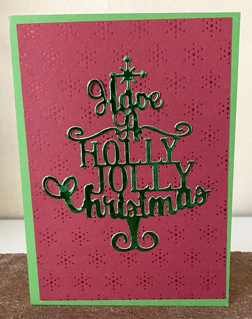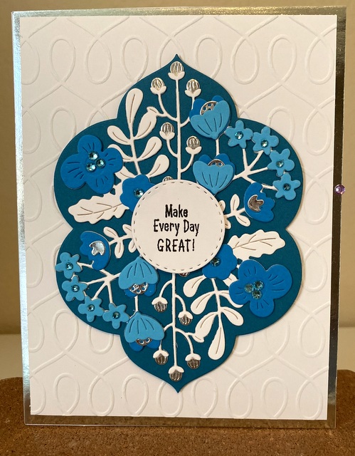 The card is 5″ by 6 1/2″. The background is a Spellbinders embossing folder.