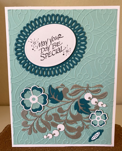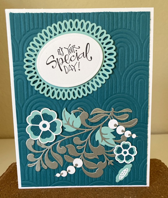 The card is 5″ by 61/2″. The embossing folder and dies are from Spellbinders.