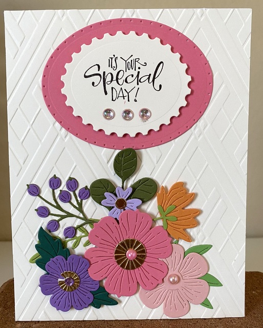 Spellbinders Happy Birthday Card #17 Feb1 The card is 5″ by 6 1/2″. The embossing folder and dies are from Spellbinders