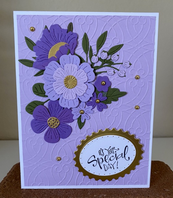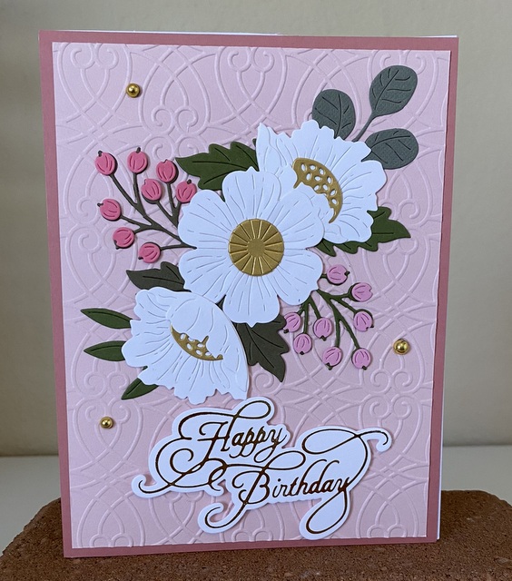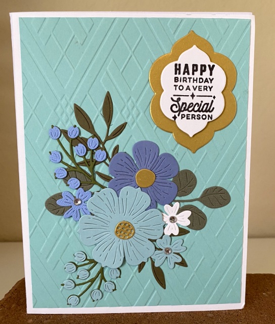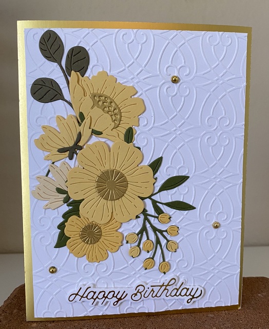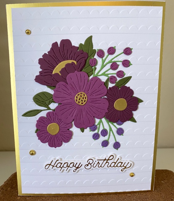 The card is 5″ by 61/2″. The embossing folder and dies are from Spellbinders.