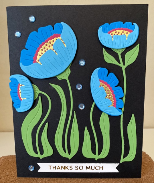 The card is 5″ by 61/2″. The embossing folder and dies are from Spellbinders.