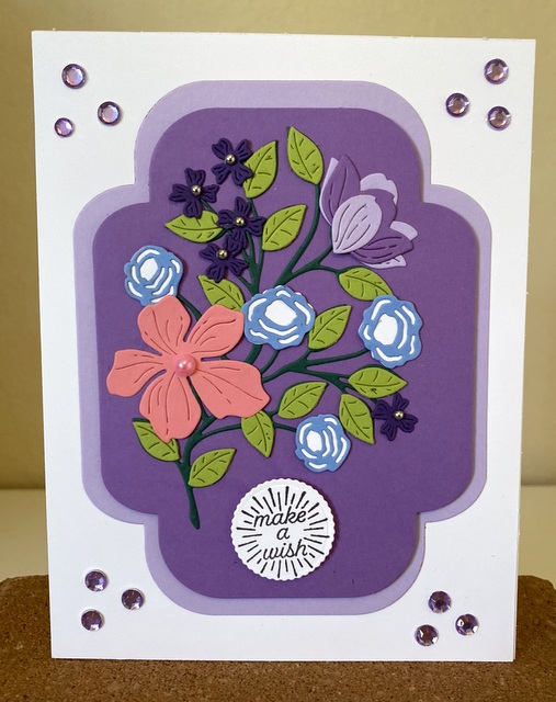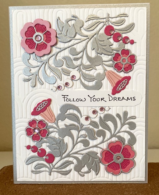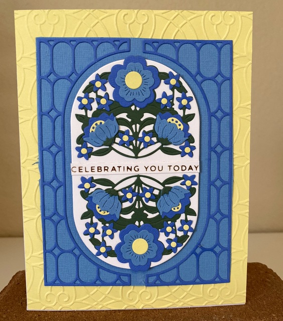 The card is 5″ by 61/2″. The embossing folder and dies are from Spellbinders.