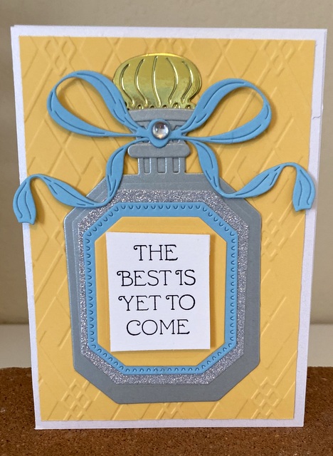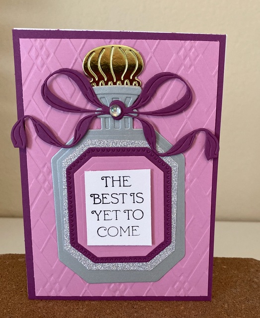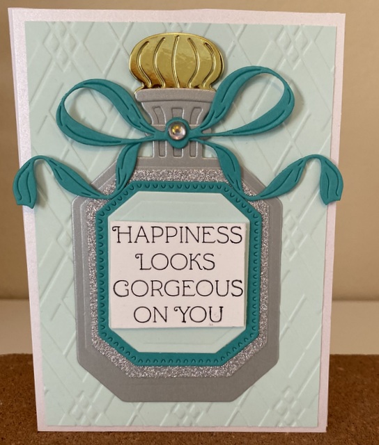 The card is 4″ by 51/2″ . The embossing folder is “Argyle Socks” and the die is “Gorgeous You Perfume Bottle”. All by Spellbinder.