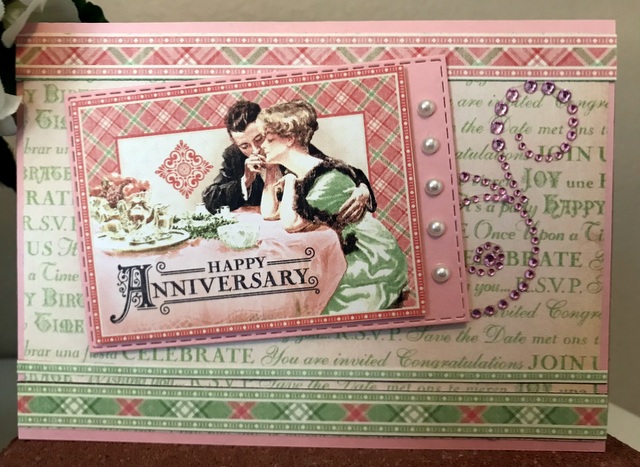 This is a 5″ by 7″ card. The pattern paper is Graphic 45 “Time to Celebrate” Collection pages “Congratulations” and “Special Occasion”.