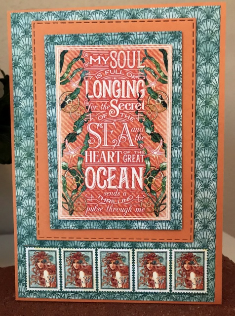 This is a 5″ by 7″ card. The pattern paper is from the Graphic 45 ” Voyage Beneath the Sea” Collection – page “Deep Blue Dreams”.