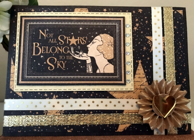 This is a 5″ by 7″ card. The pattern paper is Graphic 45 Vintage Hollywood Collection – pages “Star Studded” and “Patterns and Solids 12 by 12 paper pad.