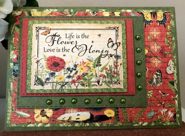 This is a 5″ by 7″ card. The pattern paper is from Graphic 45 Garden Goddess Collection and the 12 by 12 Patterns and Solids. The bling is from Queen & Co.