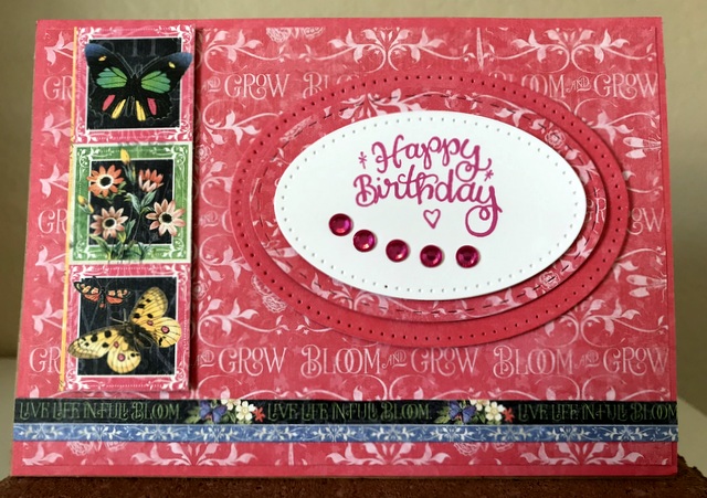 This is 5″ by 7″ card. The pattern paper is the Graphic 45 Flutter Collection -pages “Glorious” and “Exquisite” and the 12 by 12 Patterns and Solids. The die is “Stitched Ovals” by Elizabeth Craft Designs. The ink is “Passionate Pink” by Gina K Designs. The bling is “Orchid” by Queen & Co.